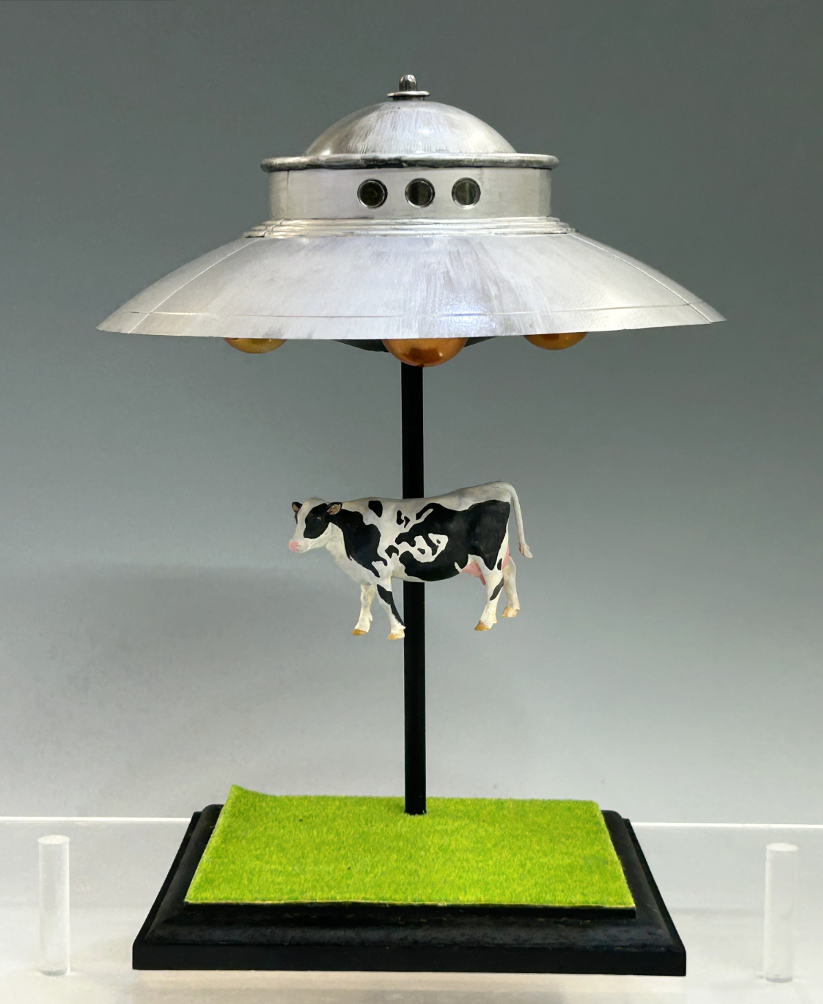 最近では人気アニメ「ダンダダン」でもこのシーンが放送され話題になった、アダムスキー型円盤に連れ去られる牛というあのお馴染みのイメージをそのまま完全再現!