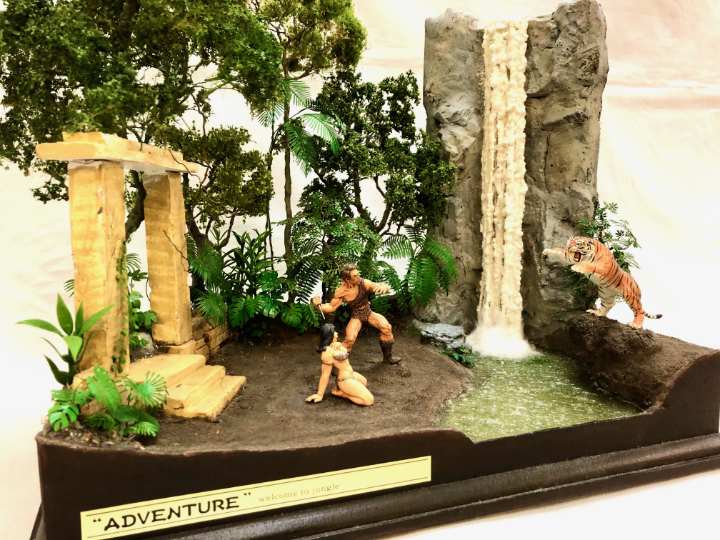 鬱蒼としたジャングルと飛沫を上げる滝が印象的なド迫力のジオラマ