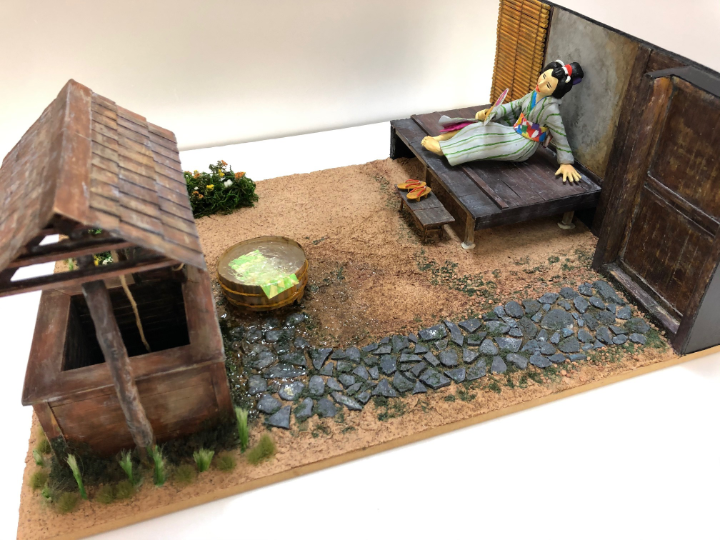 上気した縁側で涼む女性の顔と、井戸の周りの涼やかな水の表現が、