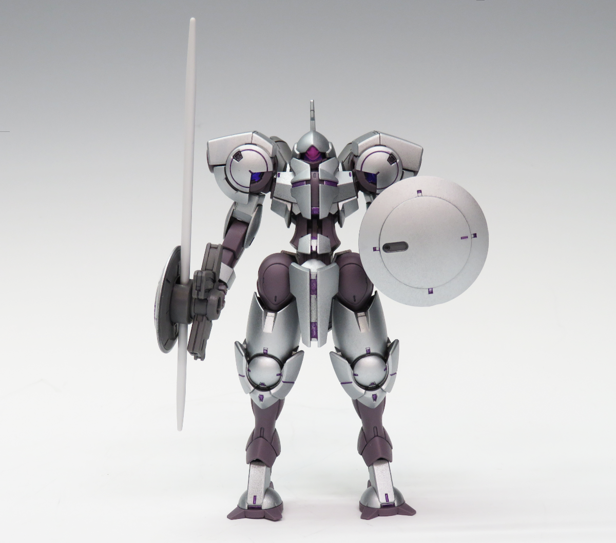 こちらもヤマさん様の作品です。『機動戦士ガンダム 水星の魔女』よりハインドリーを造ってくださいました。本来のボディーカラーの緑から、ローアウト直後ということでファレホモデルエアーの『スチール』で塗装されています。またゲームカラーの『ウォーロードパープル』が、良いアクセントになっていて、立たせているだけで中世の騎士のように勇ましくカッコいい作品になっています。ヤマさん様は色のチョイスが上手ですね。