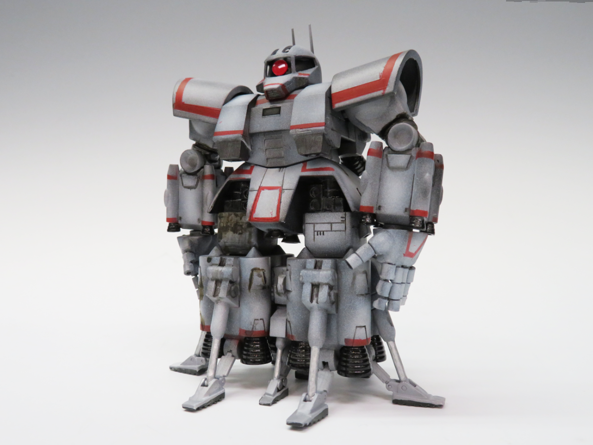 通称「タコ足」ザクですね。ずんぐりとしたプロポーションがカッコ良く、きれいに塗装された少し大き目のモノアイや改造された手首がキャラクターとしての魅力を上げいているのも良いですね。本体もただ白く塗るのではなく落ち着いた色にされておりまた、右足がエンジンブローし、ススやオイルが噴出しているというストーリーを加えることによって、テーマに沿った汚し塗装をしているのが素晴らしい。ただ単に汚すだけより説得力がありますね。