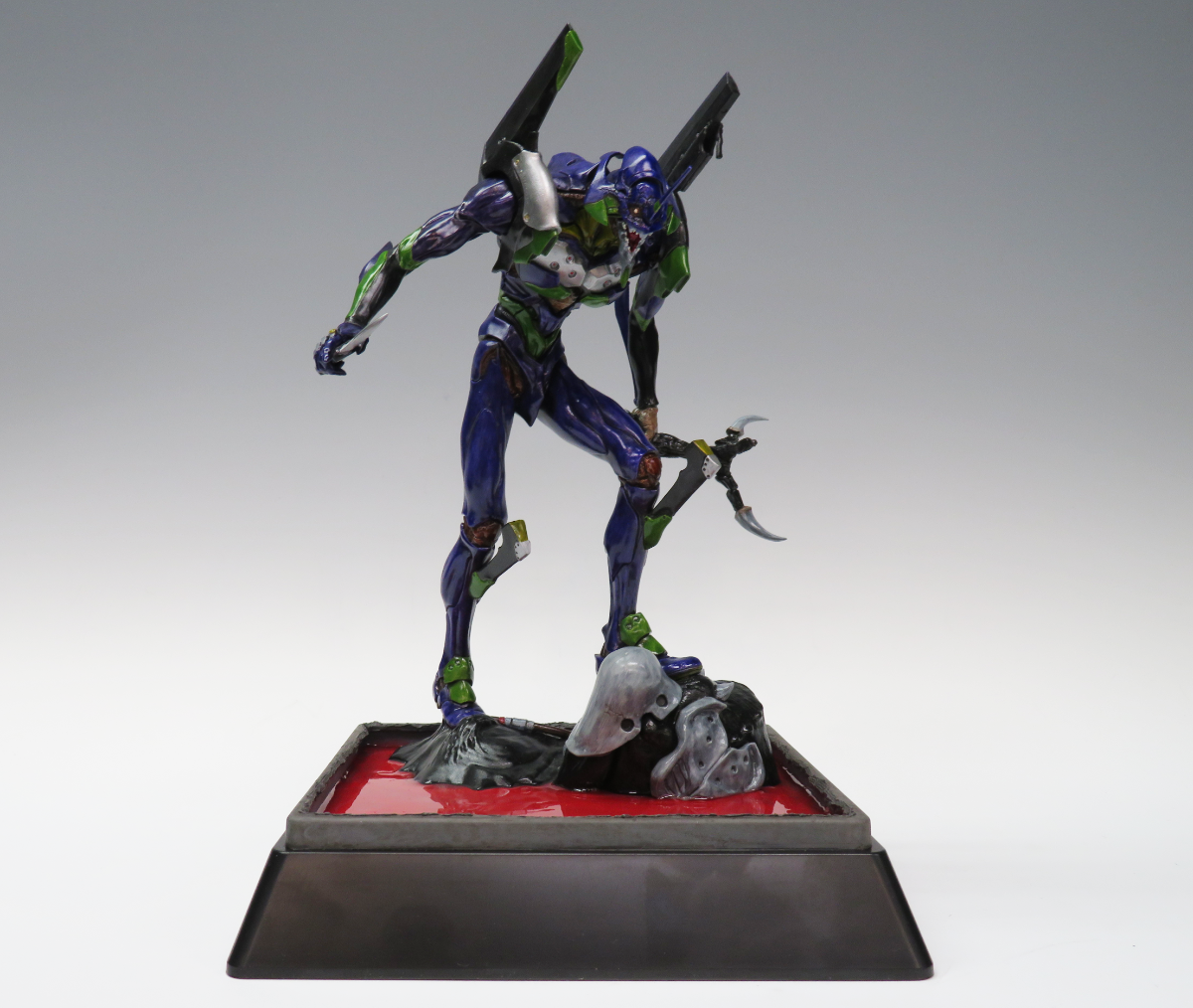 スラップチョップ技法とは暗色の下地の上に明色のドライブラシで陰影をつけ、隠蔽力の弱い塗料で染め塗りを行う技法です。まさにファレホエクスプレスカラーの得意とするところです!このキットとの相性も抜群ですね。その良さを活かし見事に初号機を仕上げてくださいました。文句なくカッコいい!ベースのサキエルにも同じ技法を使い、黒い部分も単なるまっ黒では無くゴムのような質感になっています。ベースの赤が血が流れるているような表現となっているのも見逃せない作品です。