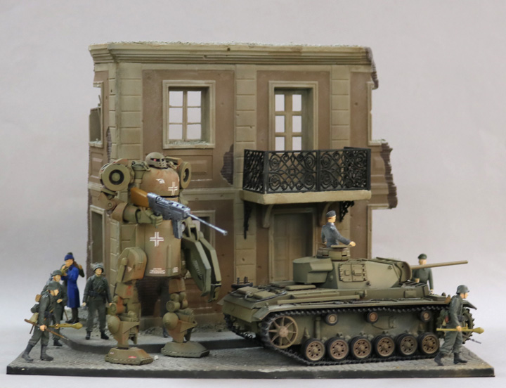 背景、人、戦車と並ぶことで異質な人形重機が世界観に溶け込んでいますね。