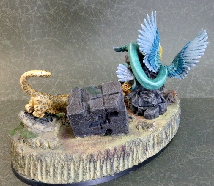 ケツァルコァトルは購入される際に一緒におすすめさせて頂いた「グリーンスタッフワールド」の「アステカの遺跡片」も使用されており、アステカ神話の神にふさわしい雰囲気たっぷりの仕上がりになっていますね!