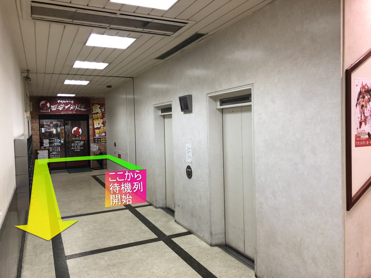 ①ボークス名古屋ショールームが入っている矢場町中駒ビル1階のエレベーター横(刀削麺様側)を先頭に写真の様にお並びください。