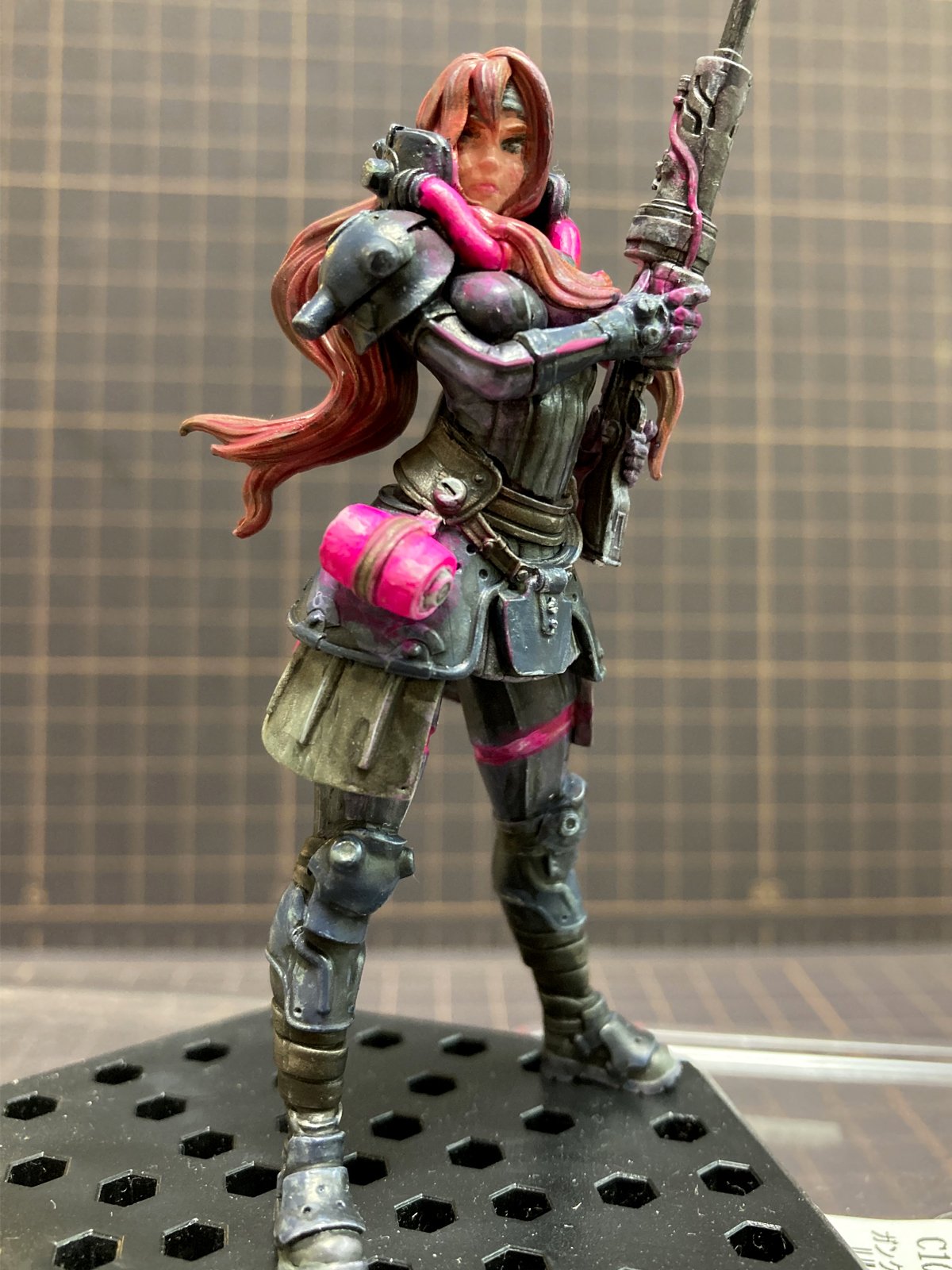 腰から下げているアイテム各種や、装甲に接続されたパイプ等々も蛍光マゼンタで下塗りをしています。