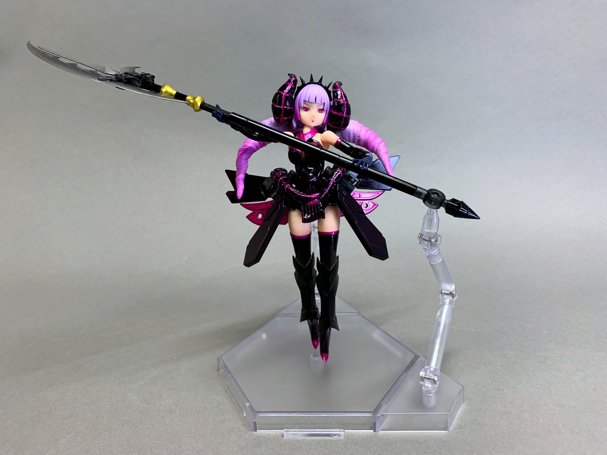 特徴的な角とロール状の髪はパテ造形で作成されているとのこと。内側にみえる紫の部分がメタリックな彩色でカッコ良きです。