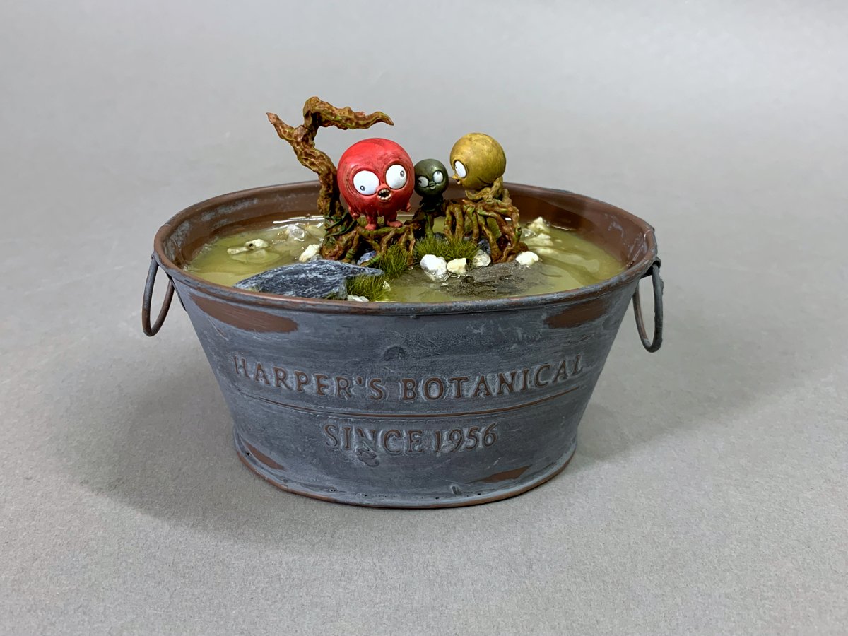 塗るプラのキジムナーが水の張った容器の中に佇んでいるようです。