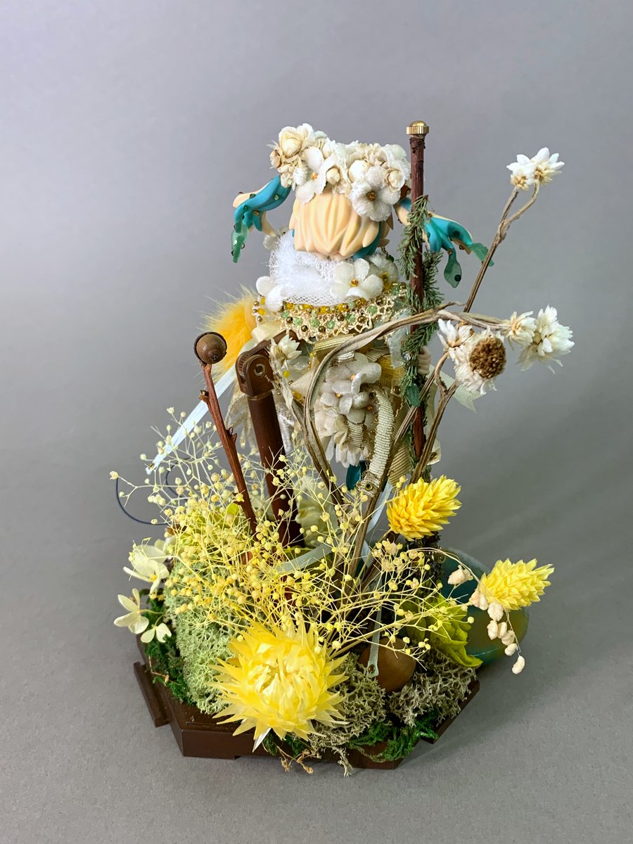 ドライフラワーなどを活用したというベースの台座も作品に世界観を加え、妖精としてのより説得力をあげていますね。