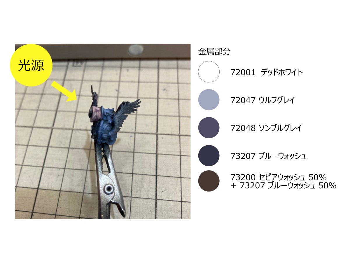 次にカラスですが、72019 ナイトブルー をベースに、72016 ロイヤルパープル で羽毛の流れを意識した影をおき、72101 オフホワイト に ゲームカラーインク 72089 グリーン を混色した色をハイライトにした上から、 73207 ブルーウォッシュ と 73200 セピアウォッシュ を混ぜたウォッシュで色味を調整しています。