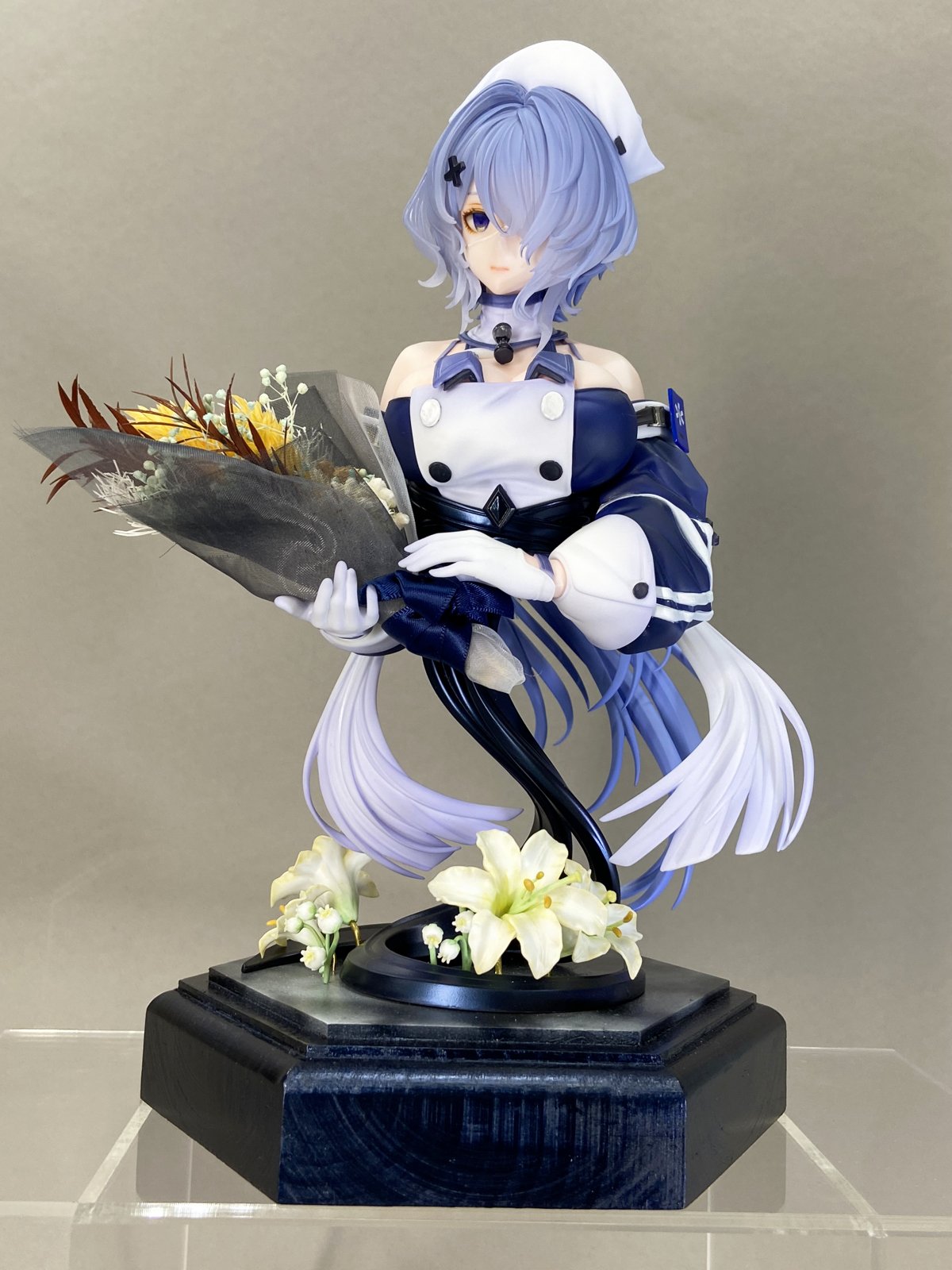 ベースに添えられたユリとスズランは、本来ウィスパーレインが持っている花束ですが、今回はご自身でキャラクターにあった造花を選んで、自作されたとのことです。