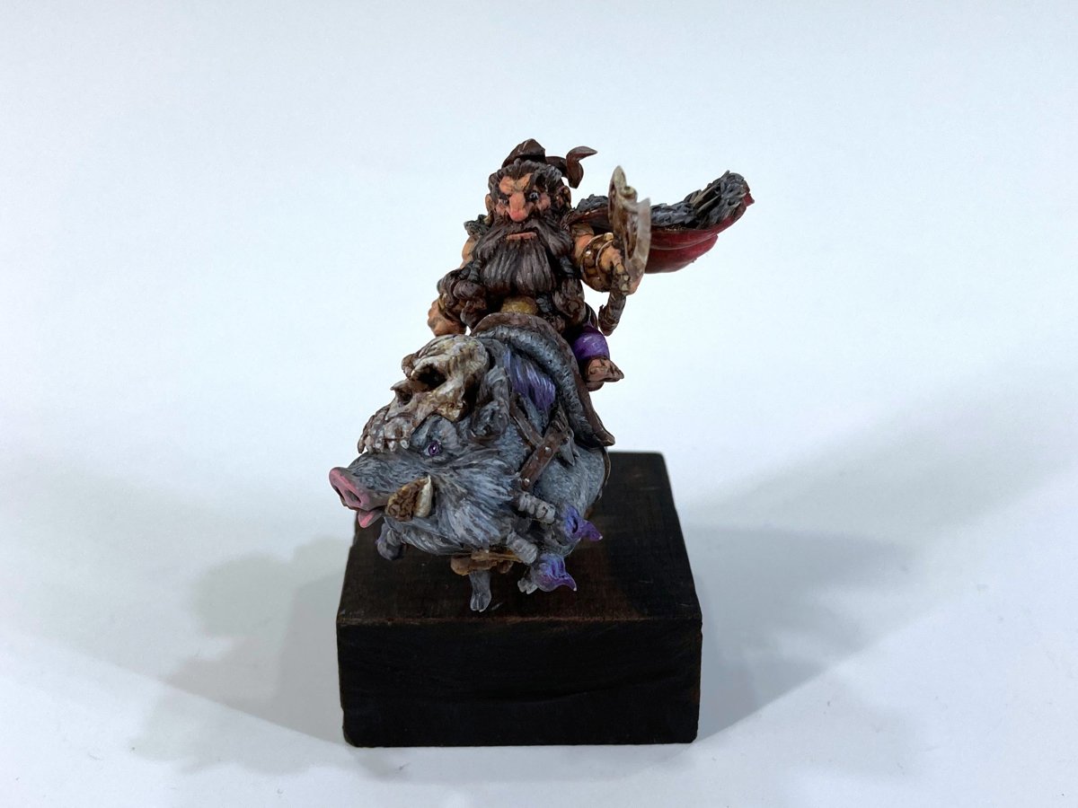 ガラールのヒゲや羽織った毛皮、乗った猪の毛並みなど毛の表現が見どころの作品です。