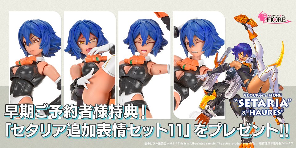 早期ご予約特典といたしまして、ブロッカーズFIOREセタリアを更に楽しめる個性豊かな表情パーツ【見下し顔】【恍惚顔】【ニッコリ顔】【やられ顔】の4種類の追加表情パーツがラインナップされた
