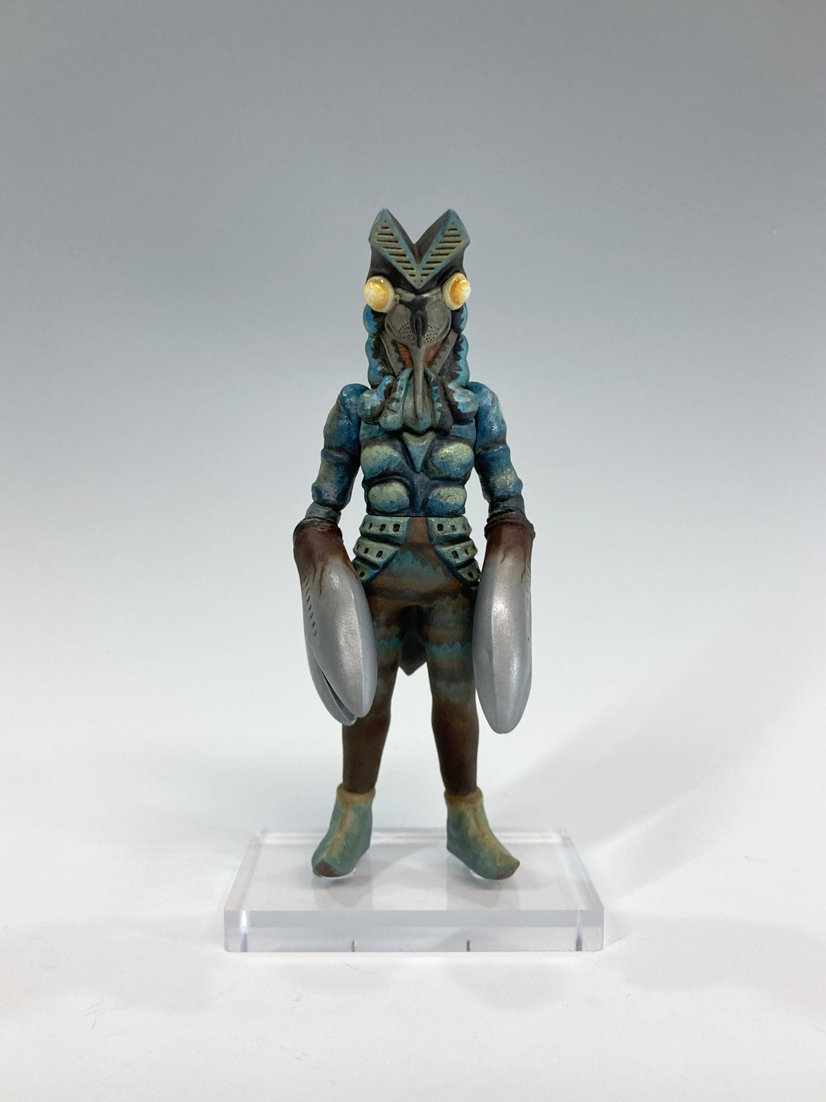 市販のソフビの改造品で、全身ほぼファレホ筆塗りで塗装。頭部と下半身のギザ模様も塗装で表現。各所グラデーション、パテによるポーズ改善も行い、理想のバルタンを目指しました。