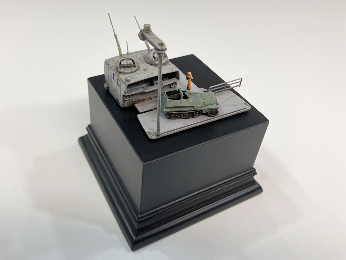 メインとなる装甲車はティターンダークブルーを主体としたグレーを調色。イエロー系でドライブラシをかけメリハリをつけました。ジャンクパーツで基地風のミニジオラマにしました。