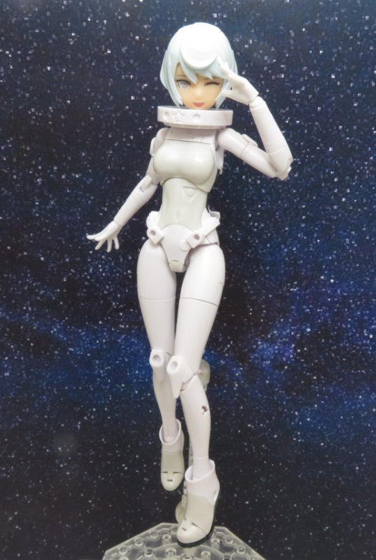 おぐち氏デザインの完全新規素体!スタイリッシュな宇宙服とパステルカラーのショートヘア、キリっとしたまなざしでクールビューティーな雰囲気!ワンポイントの脇の黒いラインはパーツで色分けされています。