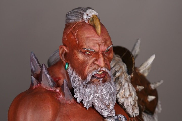 瞳の中の「悪者」感が滲み出ております。その他、各装飾の質感がリアル!肩の鎧を止めている金具!肌にあるやシワや筋肉の濃淡!「正に蛮族!」といったチカラ強さに溢れた作品となっております!