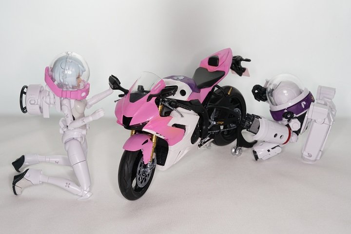 ブロッカーズFIORE「コスモス&コメット」とバイクのコラボレーション!白がメインのコスモスとコメットはワンポイント塗装で印象が変わりますね。ピンクとパープルの組み合わせバイクとの色の合わせがバイクとお揃いでチーム感がでてますね!