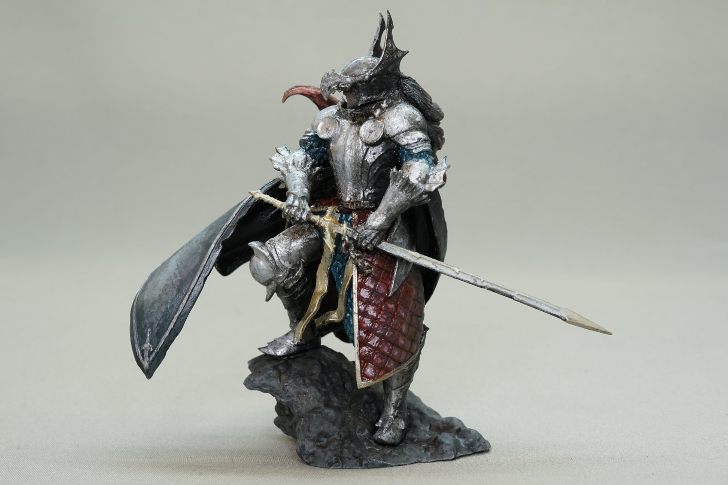 ken257様の3作目はコンペ部門作品!今回のコンペ部門初エントリー作品です!ビッグチャイルド社の英雄王ユーサー・ペンドラゴンをテーマである「光と影」で仕上げられています。重厚感溢れる甲冑やマント、装飾など光の当たり方によってハイライトやシャドーが入る事で75ミリの作品とは思えないぐらいの光と影が表れています!まるで絵画から飛び出したような、威風堂々とした佇まいが感じられる作品です。