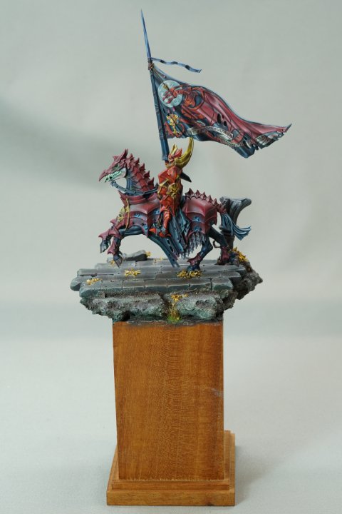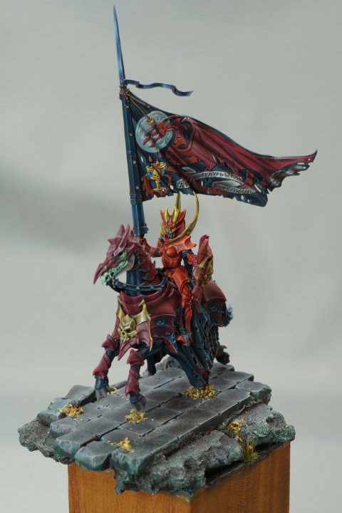 コンペ部門で銀賞を受賞されたアシヤ様!ウォーハンマーのキットでエントリーいただきました。75ミリサイズとは思えないまるでエアブラシのようなグラデーション塗装仕上げですが全て筆塗り!重ね塗りの技術力!馬の深みのある赤と鎧の鮮やかな赤の色味の対比、装備のNMM塗装などアシヤ様の匠の塗装技術が集約されています!