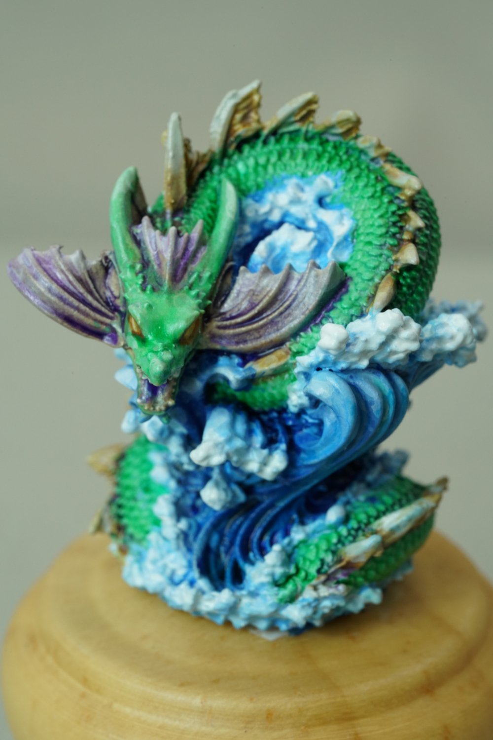 ワカツ様の繊細な塗り分け技術がこちらの作品でも!リヴァイアサン本体の鮮やかなグリーンにヒレのグラデーション、そして何色も重ねた白波の躍動感!わずか全高33ミリ!実物をご覧いただくと「このサイズでこの塗り分け・・・?」と驚かれること間違いなし!