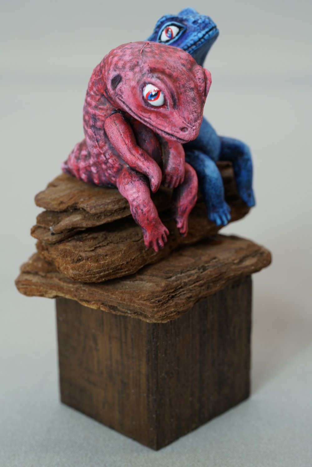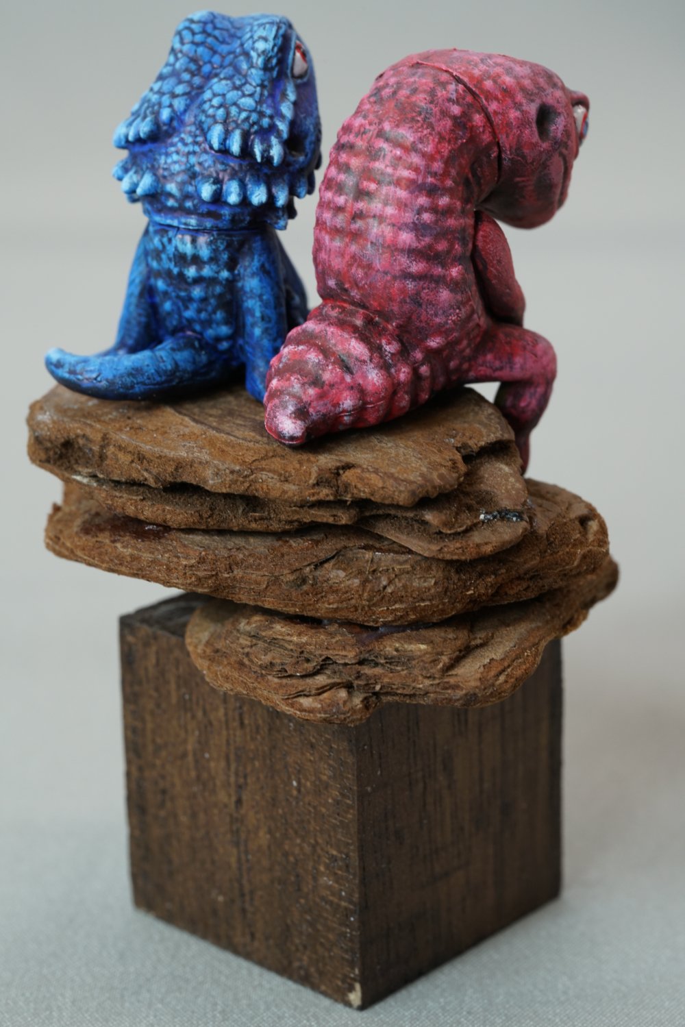 ねこうさ様の3作目はガチャガチャ「ふちやすみ」シリーズの2匹のトカゲをリペイント。青トカゲが赤トカゲを慰める可愛くも哀愁が漂う作品となっています!