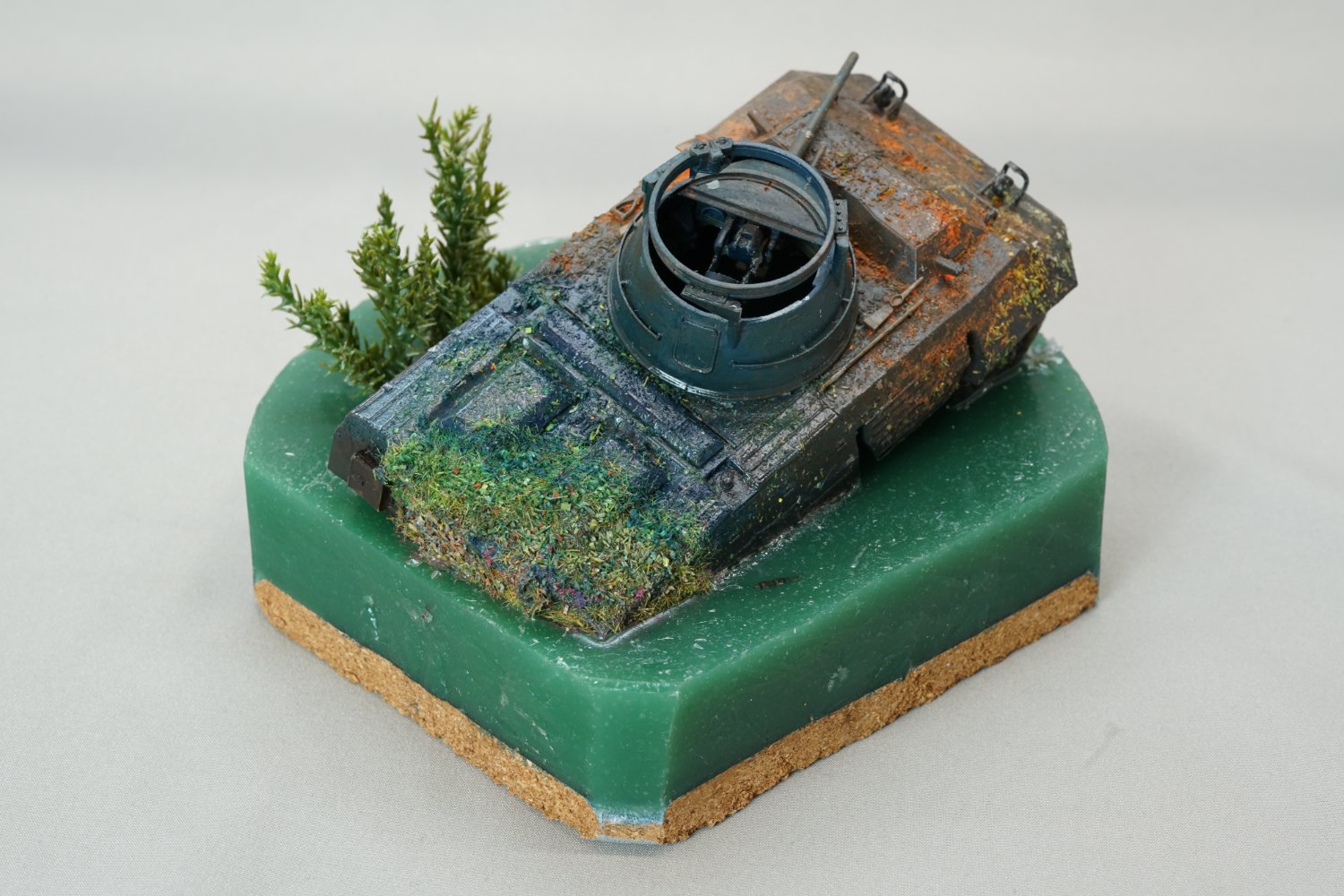 そんなグレイハウンドが森の中で半分水没し、朽ち果てたを様子が表現されています。装甲前部は風化によって錆び、後部にはコケが生えており経年劣化の度合いが伺えます!