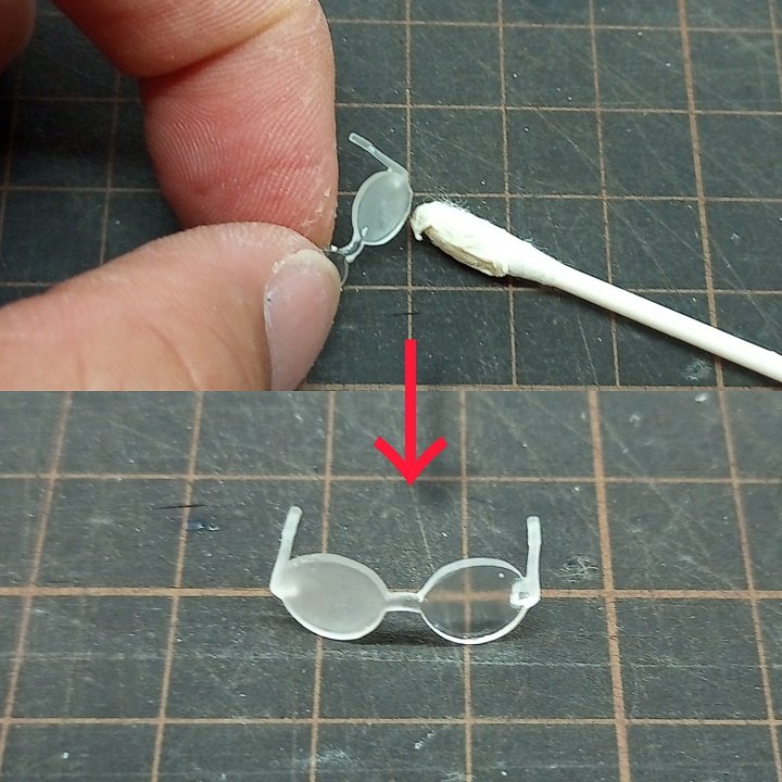 そして、最後に今回是非とも実演したかった工程の1つ、アンシーの特徴でもある眼鏡のレンズ部分を「透明化」です!