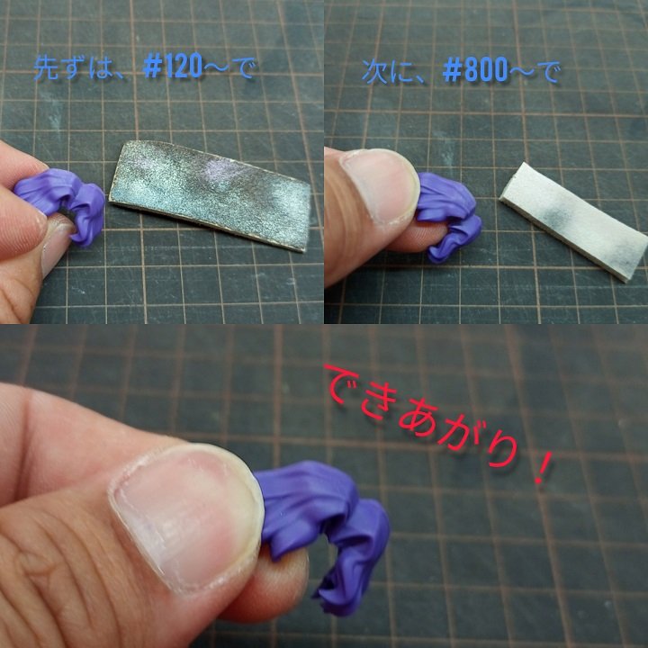 ゲートを切り落とした後に写真のように、2種類(#120~#180、#800~#1000)のスポンジペーパーにて研磨しました。