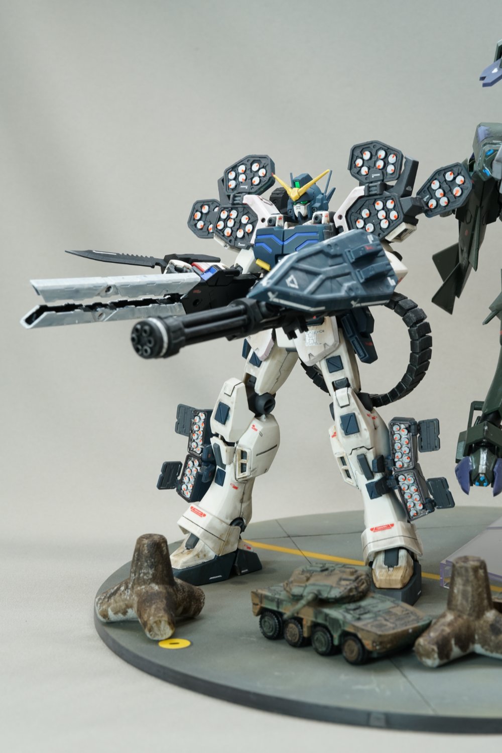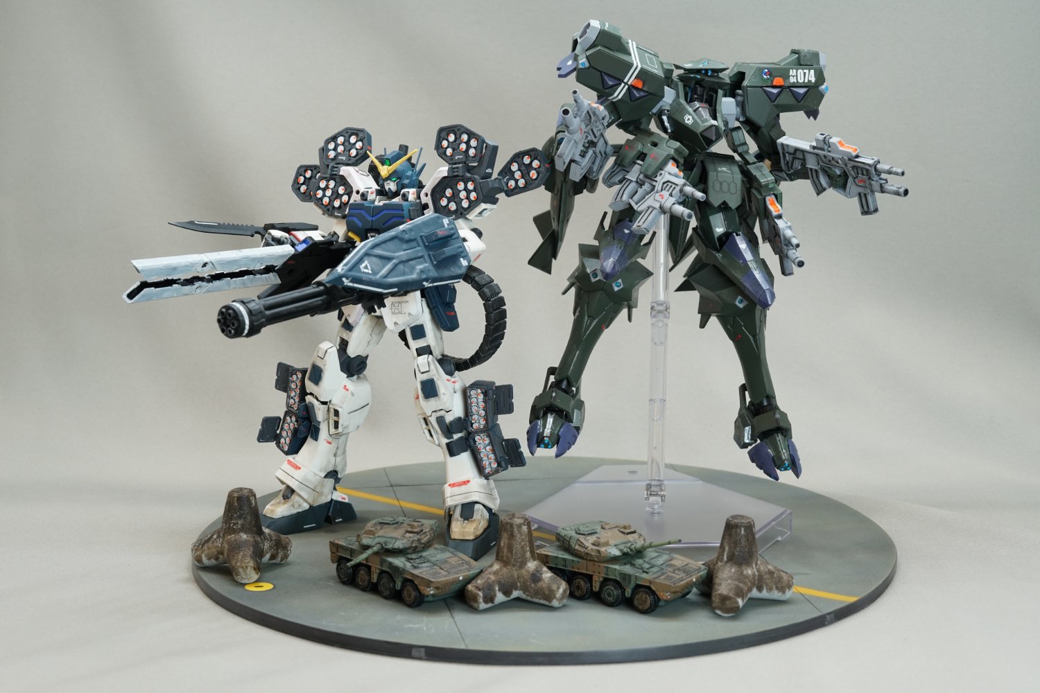 ヘビーアームズは展開したミサイルの一つ一つの塗装や、細かいデカールな細部にまでこだわりを感じます!またラプターはウォーケン仕様をベースに深みのあるオリジナルカラーとなっています!こちらも細かいデカールが大変な機体ですがラインなども忠実に再現。足元の16式機動戦闘車のミニカーもウェザリングが施されています!