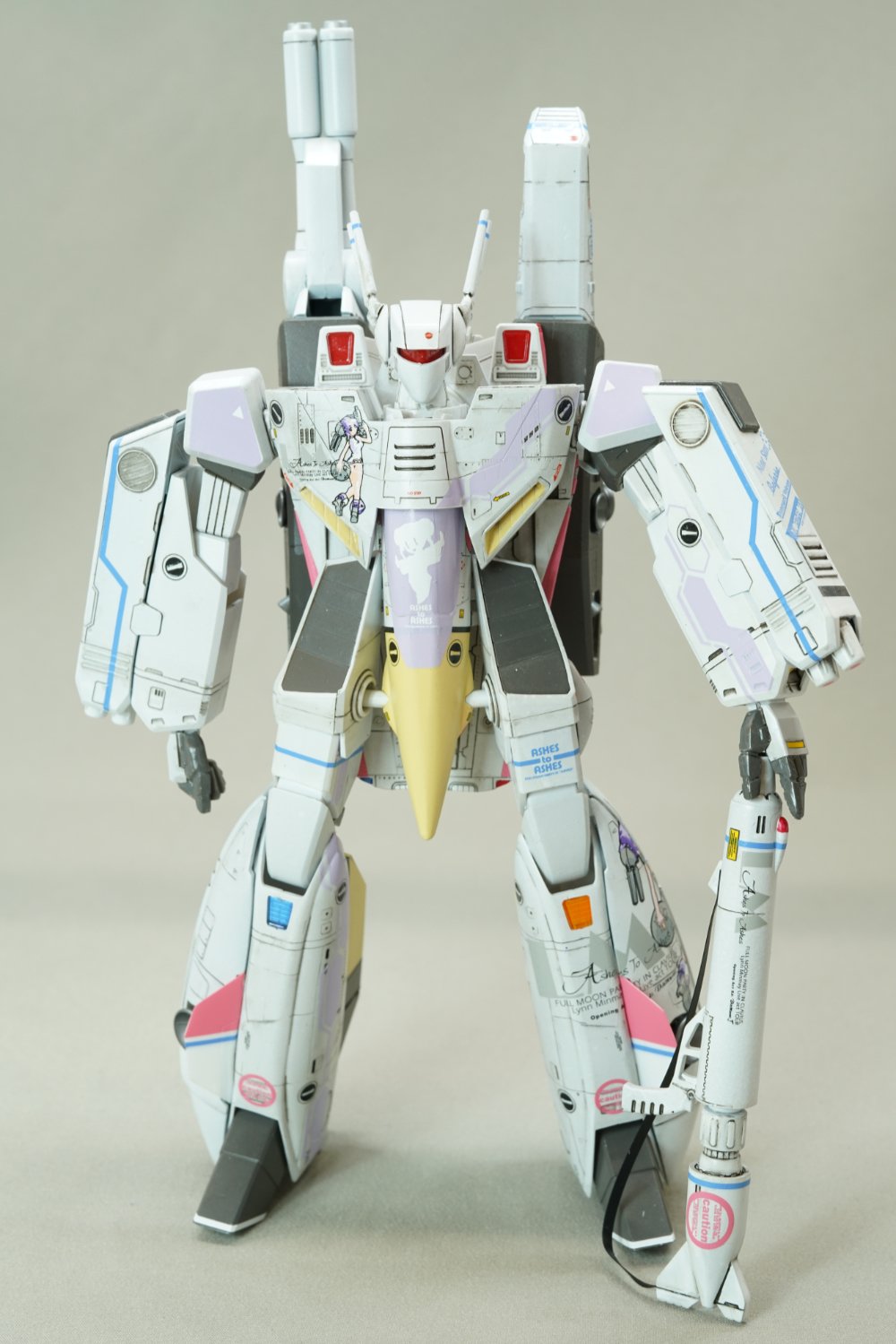全身白がメインの本体にミンメイをイメージしたパステルカラーのラインデカールなど、他のバルキリーとは一線を画すカラーリングを再現されています!雑誌オリジナルの設定ですが、IFの世界も受け入れるのがマクロスワールドそしてマニアックな機体を製作されるよしkey様のマクロス愛も伝わってきます!