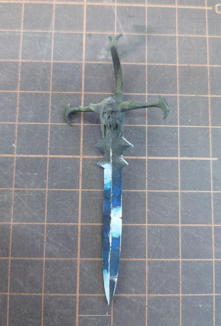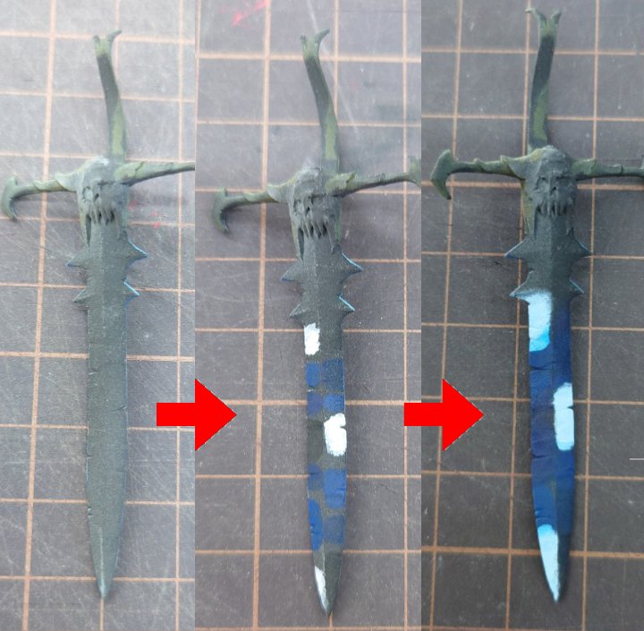 ⑤剣の刃の部分、シノギの部分、欠けた部分に白を塗装。