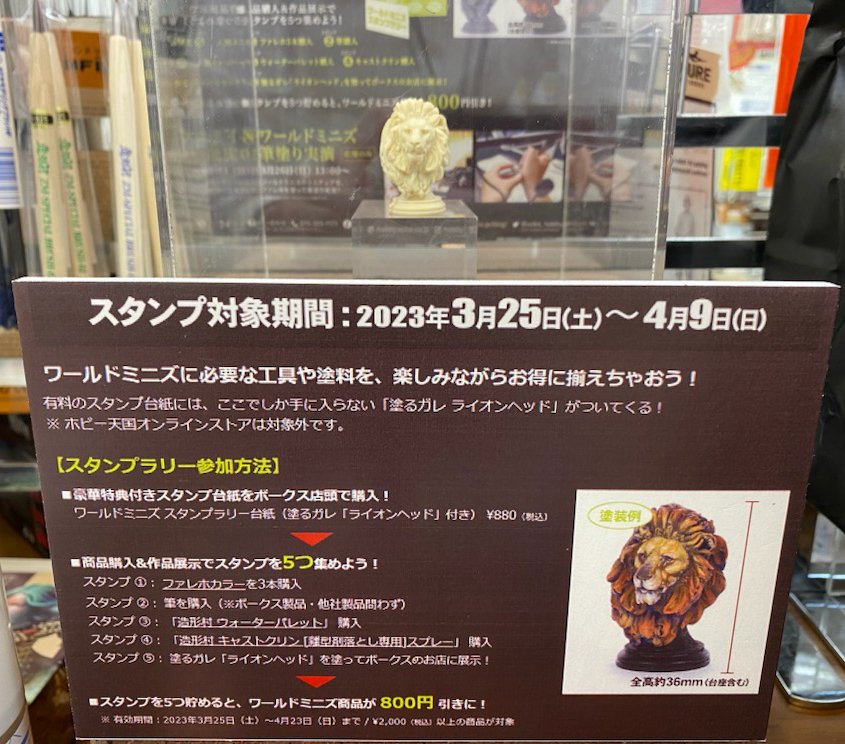 ワールドミニズに必要な工具や塗料を、楽しみながらお得に揃えることができるこのスタンプラリーには、ここでしか手に入らない「塗るガレ ライオンヘッド」がついてきます!