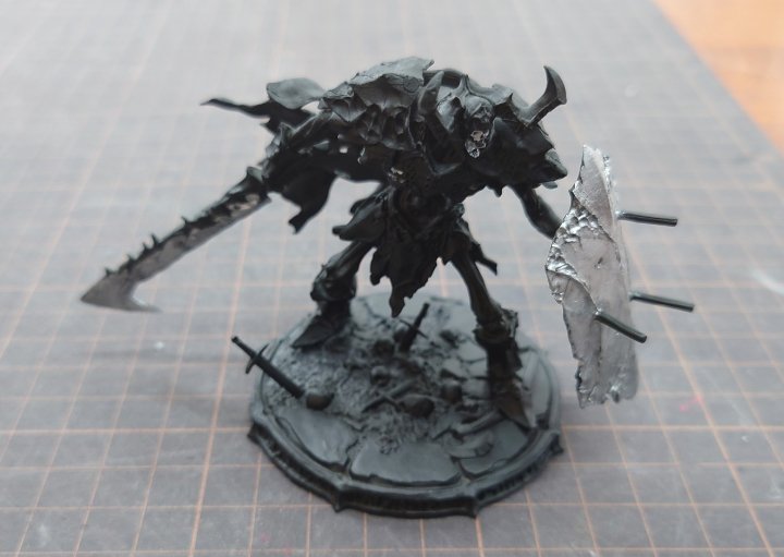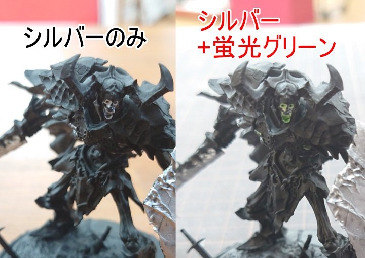 ちなみに下地がブラックのまま、シルバーを塗装せずに蛍光グリーンを塗り重ねた場合は前回実演したリザードキンのような状態になります。