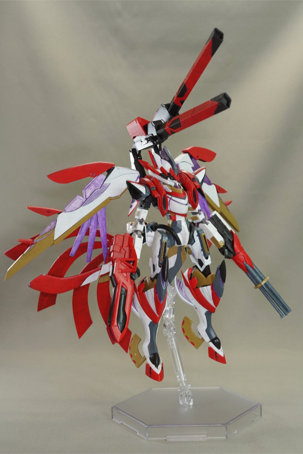 近年のロボット(といっても10年前・・・!)らしい複雑なデザインと色分けで塗装が難しいキットですがヒロイックなカラーリングの機体は良いですね!