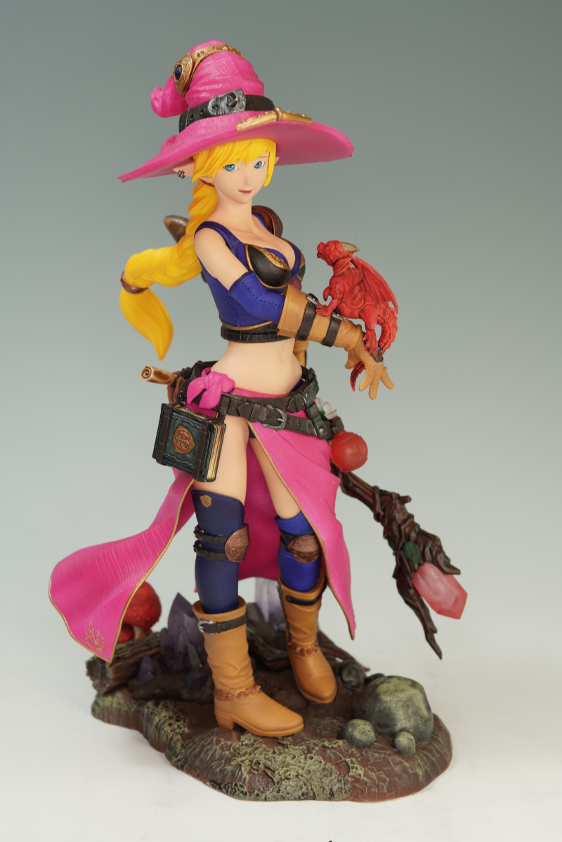 H.N様には3作品お持ちいただきました!まずは手乗りの竜の子を携えた旅の魔女。アルニ工房のガレージキットです。ゲームエアーによる鮮やかな色味が美しい!ビビッドなピンクや青が印象的です。装飾も各質感を表現した色味となっています。