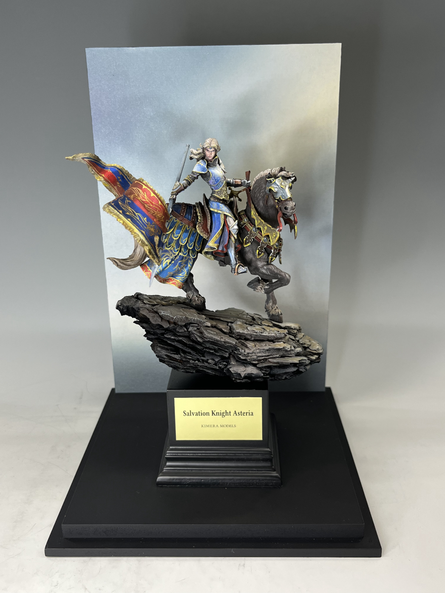 数多くのミニチュア作品をお持ちいただくコーイチ タケダ様には2作品をお持ちいただきました!1作目はミニチュアペイント部門金賞受賞!キメラモデル社の大型キット・救国の騎士アステリア(騎乗ver.)です。崖の上から戦況を見下ろす姫騎士を繊細な筆塗りで仕上げられています。馬の毛並みも細かい!旗の塗装はまるで本物の糸で刺繍されたかのような表現となっています。