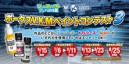 また、今話題の水性塗料「ファレホ」「Kカラーズ」「MMP」を使った作品を大募集中の「V.K.M.ペイントコンテスト3」へのご参加もお待ちしております!作品の中にどこか一箇所でも「ファレホ」「Kカラーズ」「MMP」のいずれかの塗料で塗装してあればご参加頂けるコンテストになっております。詳しくは、公式サイト、公式Twitter、店頭でご確認下さい!