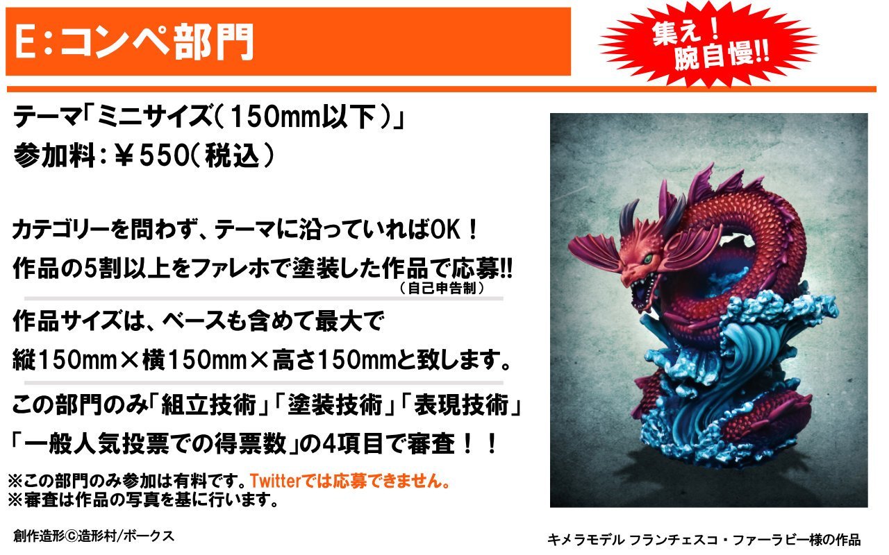 こちらのE:コンペ部門ですが新しく追加された部門となっており、他の部門とは異なり、審査員が「組立技術」「塗装技術」「表現技術」「一般人気投票での投票数」の4項目で審査となっております!!