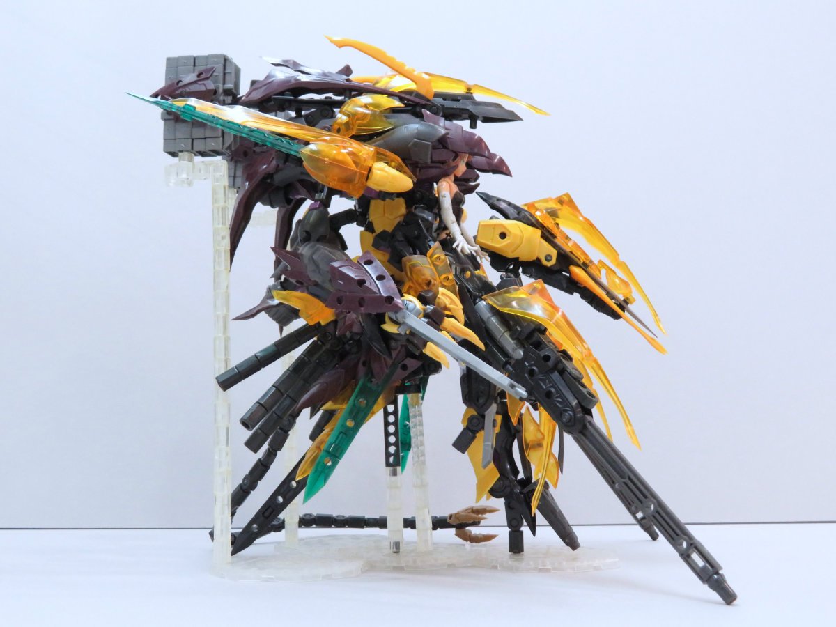 スタッフコメント:このカラー、ローレル・フォリアの表情。危険な香りがしますね。イスラムの宇宙誌文献では「神が荒ぶる大地を天使に背負わせたが定まらず、天使の足元に岩盤を、岩盤を支える世界牛を、牛を乗せる大魚(バハムート)を、という配列で安定を達成できた」ということでまさに今回のテーマにぴったりの作品。「ブロッカーズFIORE ローレル・フォリア」を中心にカラー、形状をバランス良く超重武装の大型機体に仕上げるセンスは流石です!