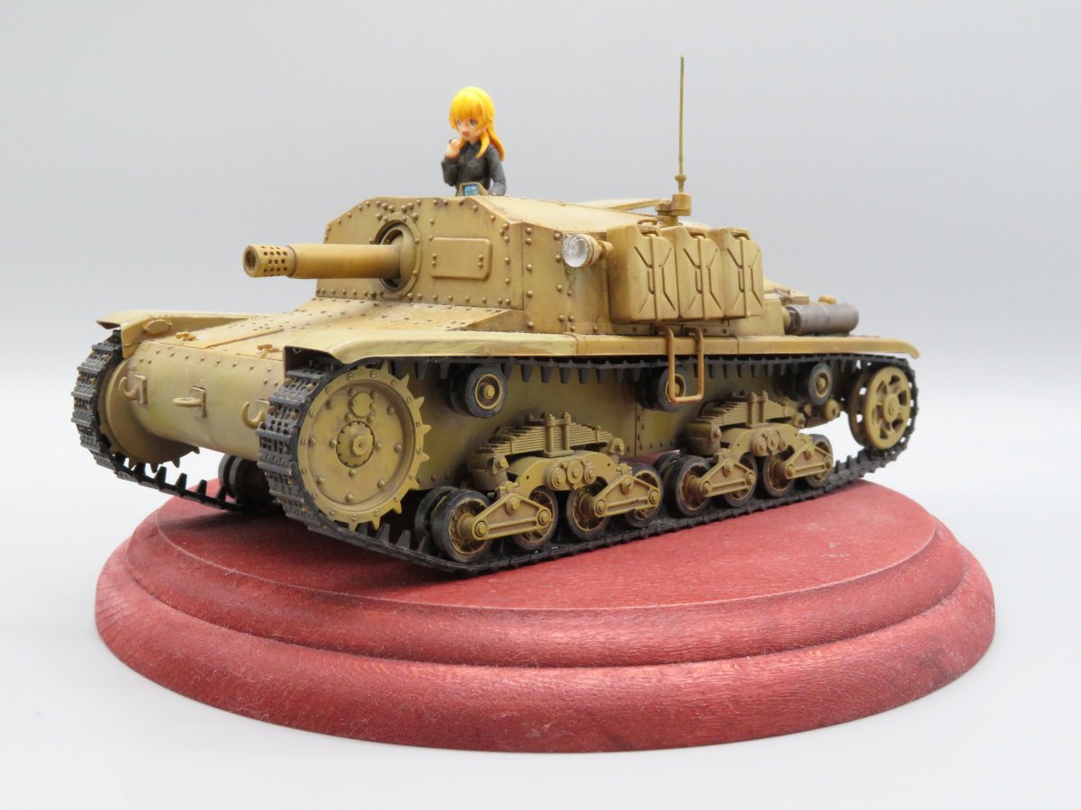 スタッフコメント:「ノリと勢いとパスタの国」といえばのアンツィオ高校の校章がトレンドマークのセモベンテ!装甲部分がとてもリアルで錆の液だれ感や、全体的に砂ぼこりで汚れたかのようなウェザリング塗装が本物のように見えます!副隊長のカルパッチョのフィギュアも細かくしっかりと色分けされていて素晴らしいです!