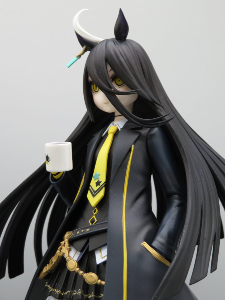 スタッフコメント:史実の「マンハッタンカフェ」は艶のある綺麗な青鹿毛と額から鼻筋までの白斑が特徴ですが、ウマ娘になると黒色のサラサラとしたロングヘアーと白いアホ毛がとても可愛いですね!神垣様のコメントにもありますが一つに黒と言っても髪の毛、尻尾、コート、シャツ、タイツと全て同じ黒でも色味や艶が違いますね!ベルトの装飾品や、コートに入っている刺繍と細かな色分けもしっかりとされていて素晴らしいです!