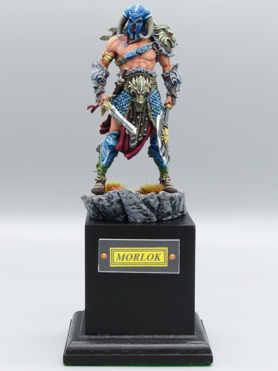 スタッフコメント:キメラモデルの「狼の息子モーロック」を塗装してのエントリーありがとうございます!両手の武器はシルバーのような鋭い輝きをノンメタリックメタル塗装で表現されており、内側の刃は鎧の青色が反射して色が変わっていたり、影の部分になる所は光が当たらないので輝きが消えているなど、明るさによる輝き方、見え方を熟知されているからこそ成せる技だと思います!そして鎧や両腕の籠手、肩当やベルトもノンメタリックメタルを用いてそれぞれ違った金属の質感を表現されているのも素晴らしいです!