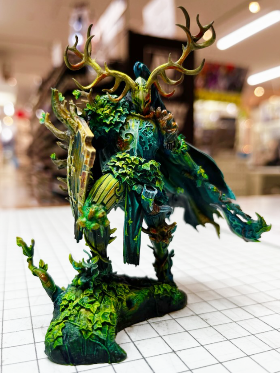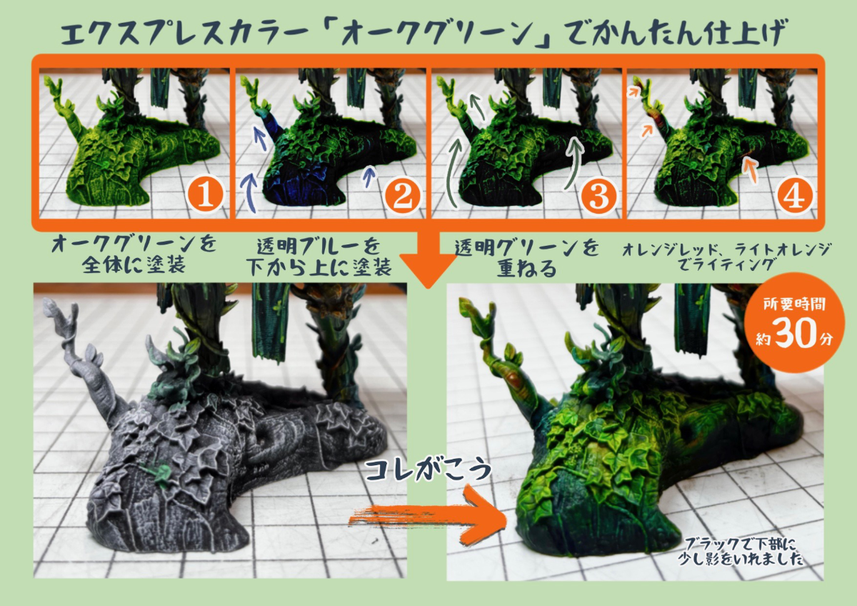 さて、こちらの「緑の騎士」、実はパッケージアートの再現をメインテーマにして塗装していましたが、最新のファレホシリーズ「エクスプレスカラー」を使用して(2年前に)塗装済みの本体との違和感なくヴィネット部分の再現が可能か試してみた工程がこちらになります↓