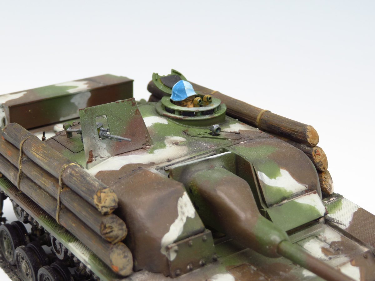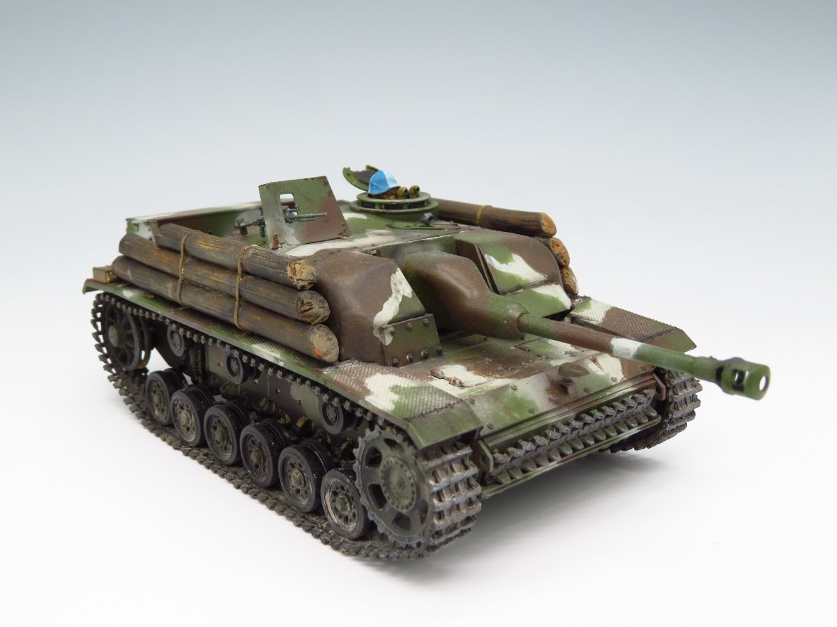 スタッフコメント:フィンランド軍が使用するⅢ号は、普通の戦車ならシュルツェンや履帯を装備する車体側面に丸太を取り付けたり、戦闘室の前面にコンクリートブロックをくっつけたりと防御に特化したユニークな装備が目立ちますね!履帯や転輪の少し錆びれた感じや、丸太の樹皮が少し朽ちて黒くなっている所など年季が入った感じがカッコイイです!迷彩も森林地帯に合わせた配色となっていて、模様を丁寧に描かれています!