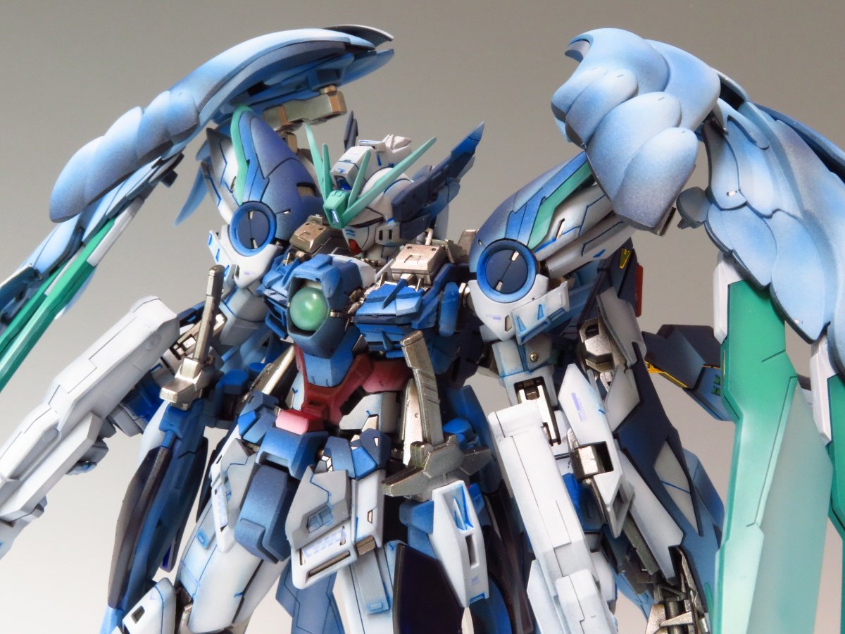 スタッフコメント:MGのウィングガンダムに、HGの「ウィングゼロ炎」や「フリーダム」の翼を上手くミキシングされていて、統一されたデザインがとてもカッコイイです!装甲部分の淡い青色のグラデーションに対して、フレームや関節部分のギラギラと輝く金属らしい光沢がよりメカらしさを際立ててますね!