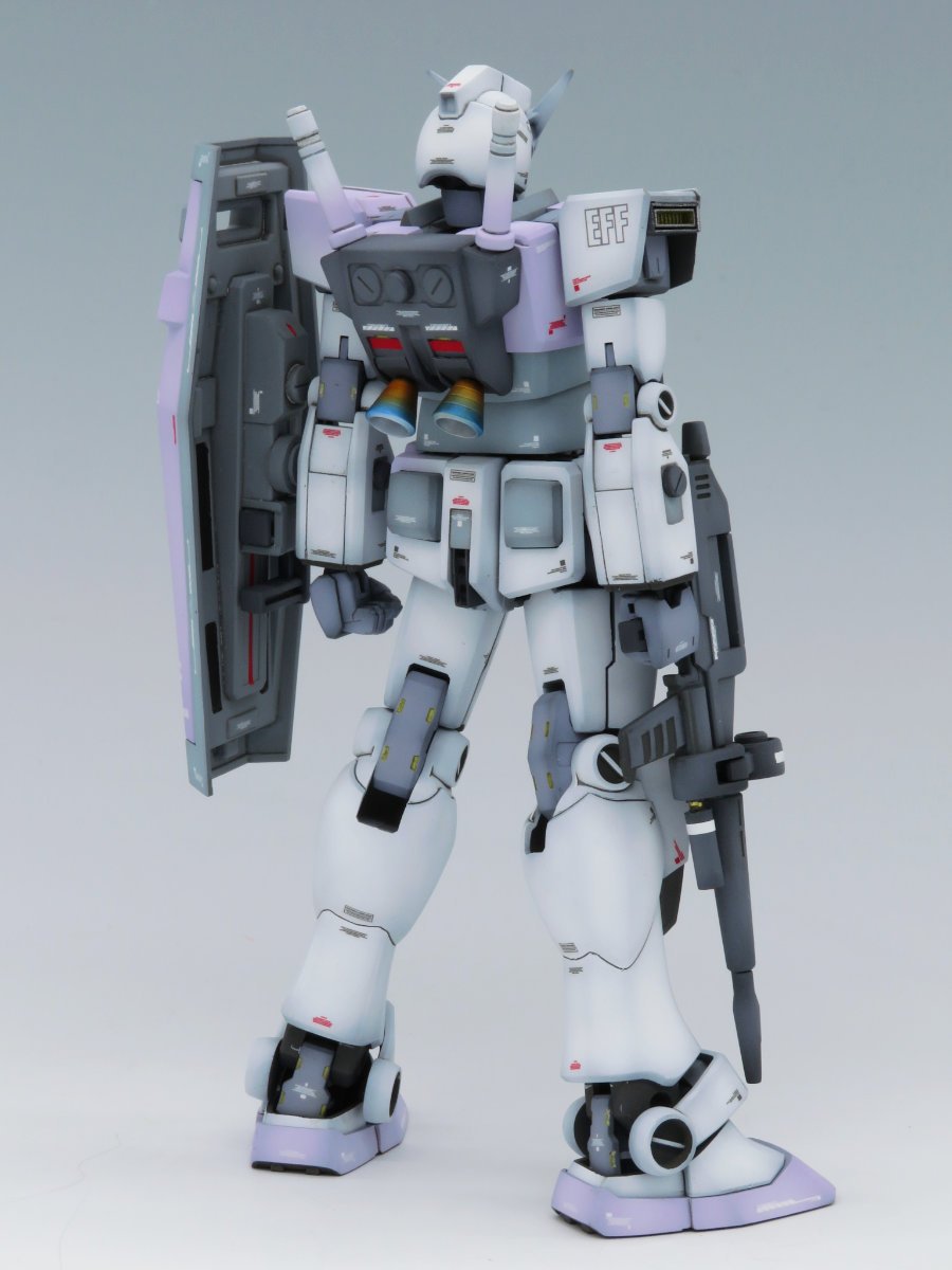 スタッフコメント:エントリーグレードとは思えない細かな塗り分け、デカールと情報量モリモリの見た目が凄くカッコイイです!カラーリングはグラデーションを意識された塗装が面白く、胸部などパステル調の淡い紫を使用したり、濃い目のグレーを使用したりと、G3ガンダムのような配色も良いですね!そしてバックパックのバーニアは熱で変色していたりと細部まで拘りを強く感じました!