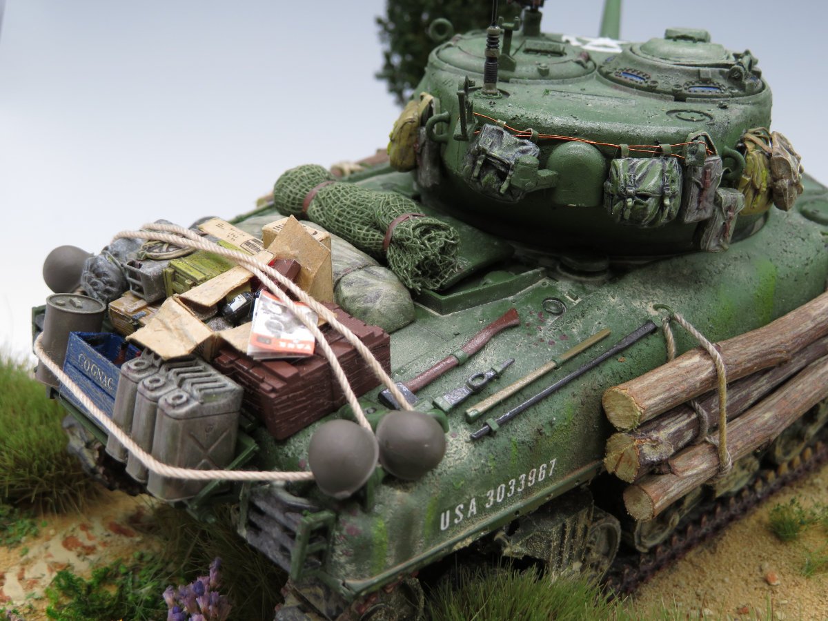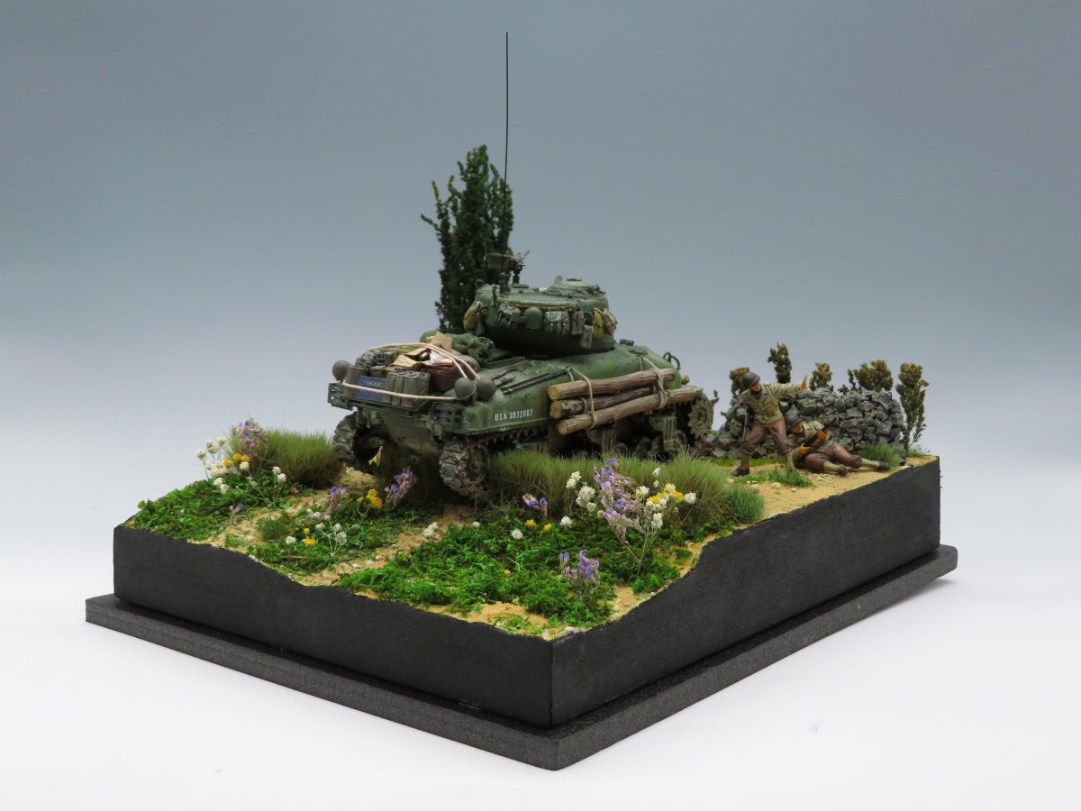 スタッフコメント:第二次世界大戦において1944年7月25日から7月31日にかけてアメリカ第1軍により行われた「コブラ作戦」をモチーフに、M4シャーマン76mm砲をジオラマで表現されています!車体に括りつけられた小物など全て細かく塗り分けられており臨場感に溢れていますね!