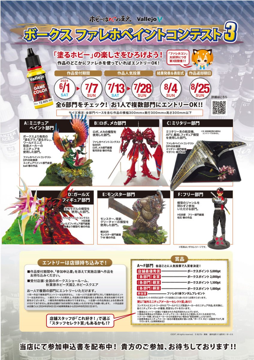 今回ご紹介させていただきましたエントリー作品は、現在ボークス店内奥のショーケースにてご覧いただけます!「ファレホペイントコンテスト3」のエントリーは7月7日(日)まで受け付けております!詳しい参加条件や参加部門などは「ボークス公式ホビー総合サイト」、または店頭にてご確認ください!