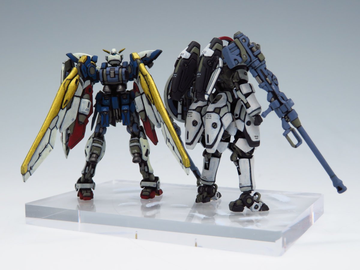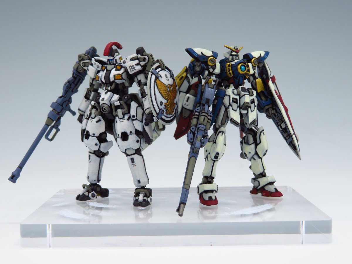 スタッフコメント:どこからともなくヒイロ・ユイが現れて敵機を撃墜するのが見えてくる作品タイトル!主人公機のWガンダムと、ライバル機のトールギスを細部までしっかりと筆で塗装されていますね!特にトールギスの肩等の装甲部に手書きで描かれた文字が凄い!二機がのっている台座には更に手書きで描かれた白い羽がとても綺麗なので、ぜひお近くでご覧ください!